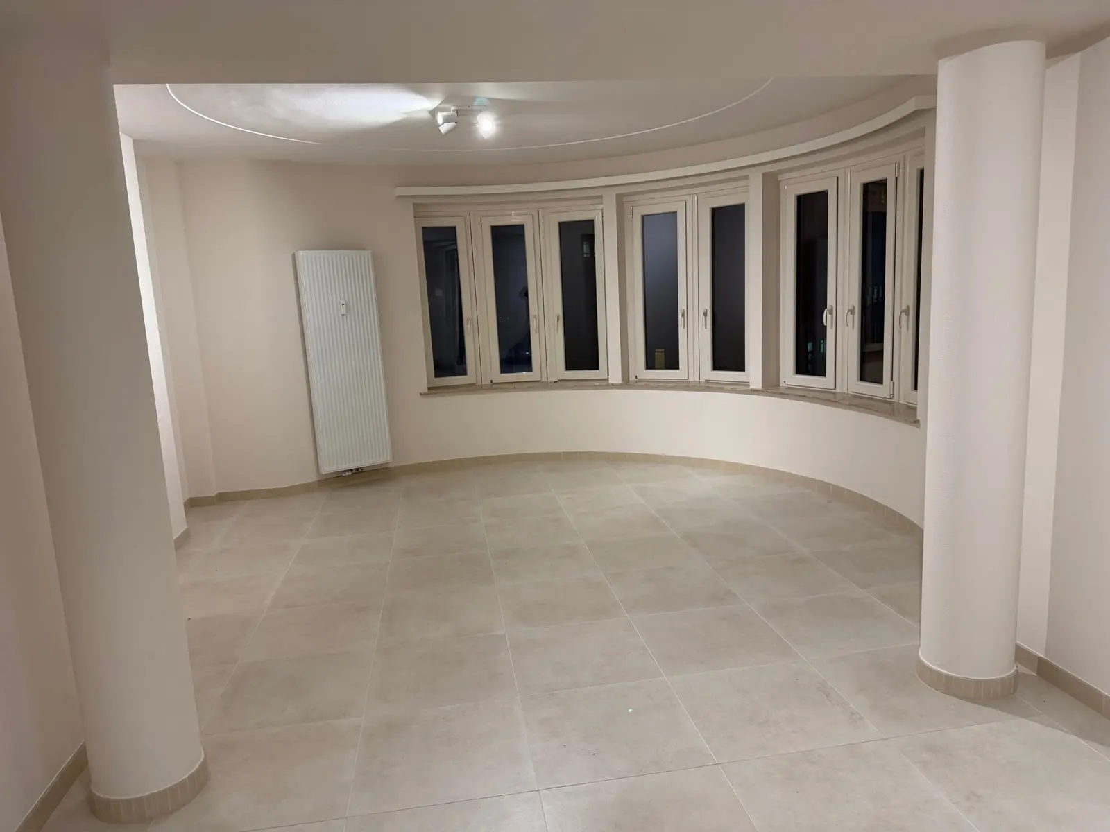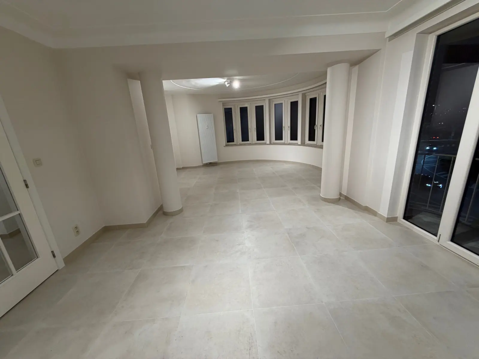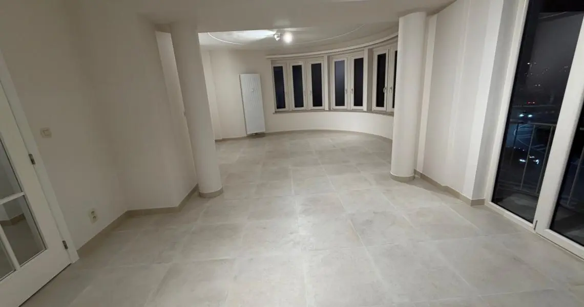 Appartement comprenant : hall d'entrée, wc individuel, cuisine équipée, buanderie, living en rotonde, hall de nuit