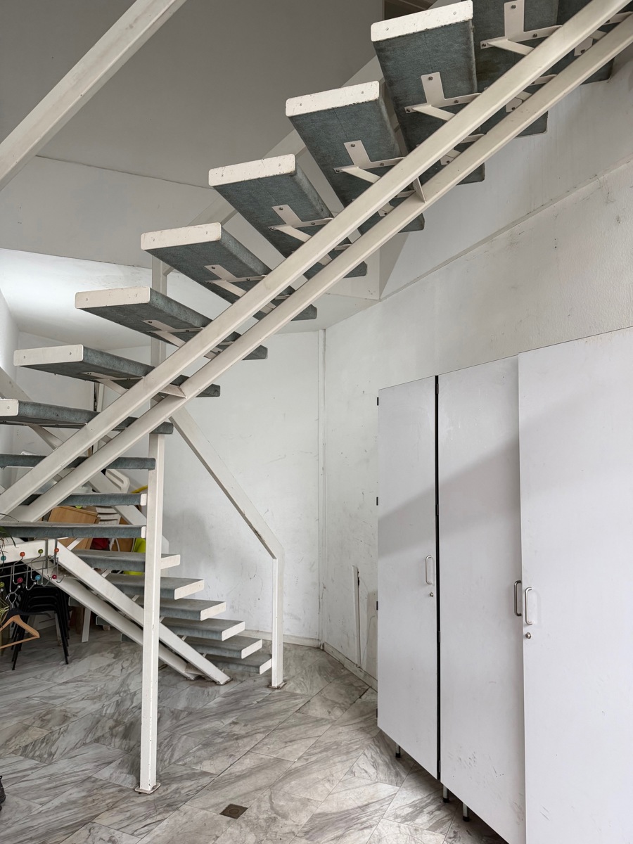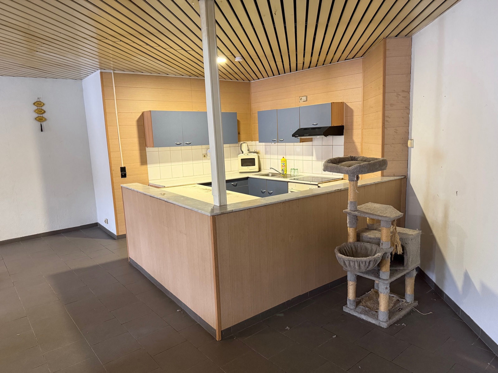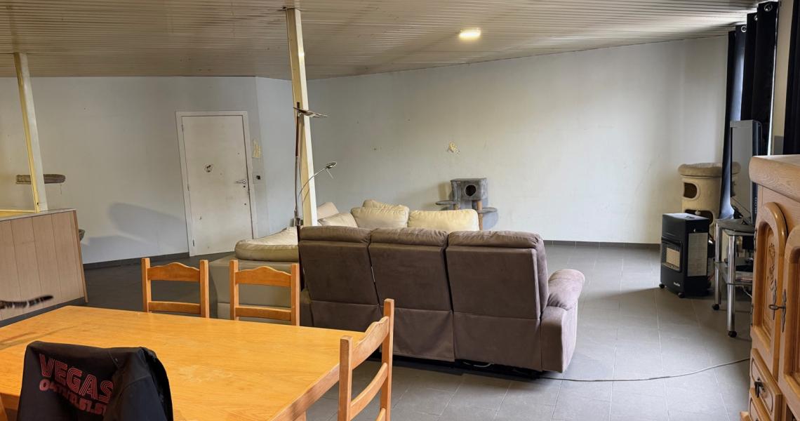 Vaste hall d'entrée en rez-de-chaussée avec accès à l'étage par escalier donnant dans un grand hall (bureau), spacieux living avec cuisine-équipée (65 m²), salle de bain avec baignoire + wc, buanderie, 2 chambres.