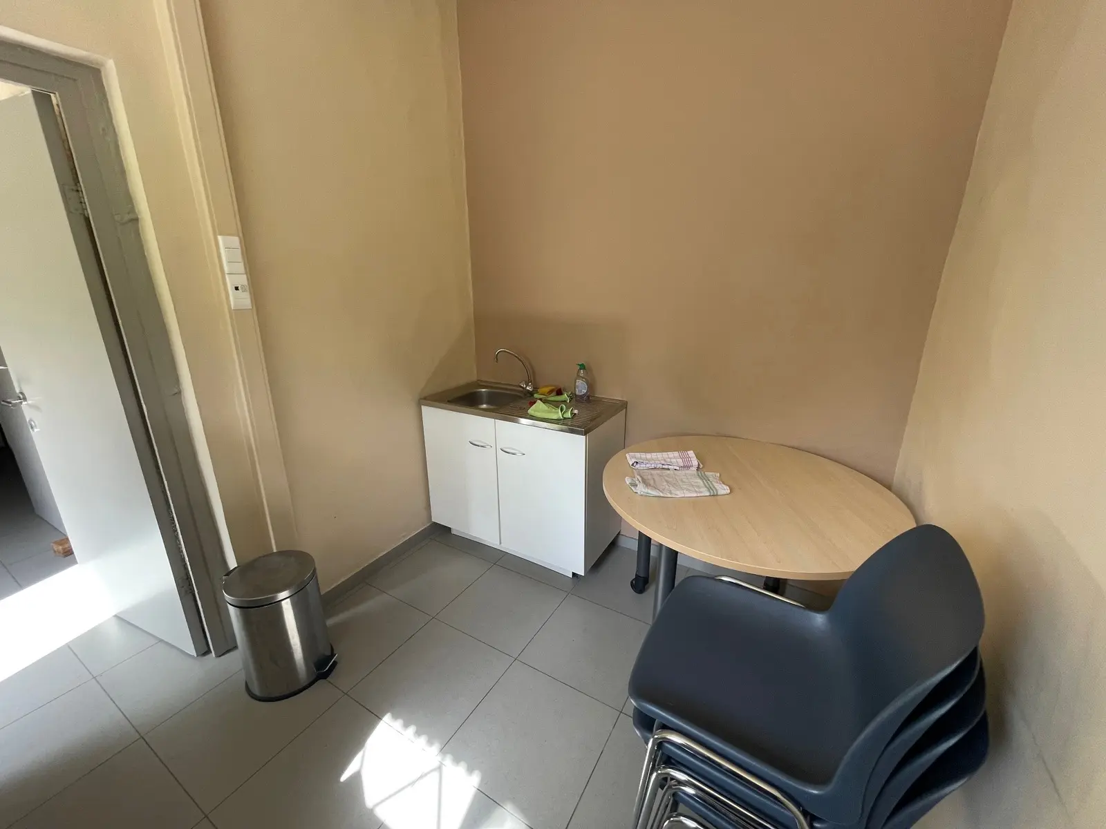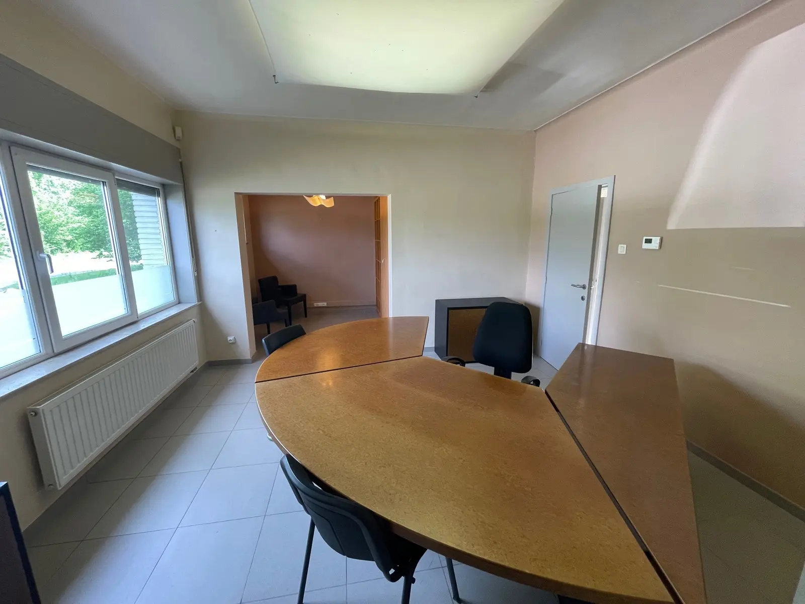 Rez-de-chaussée : hall d'entrée, wc individuel, bureaux 33 m², grand hall amenagé en meubles classement, bureau 30 m², hall arrière, coin cuisine, garage carrelé.