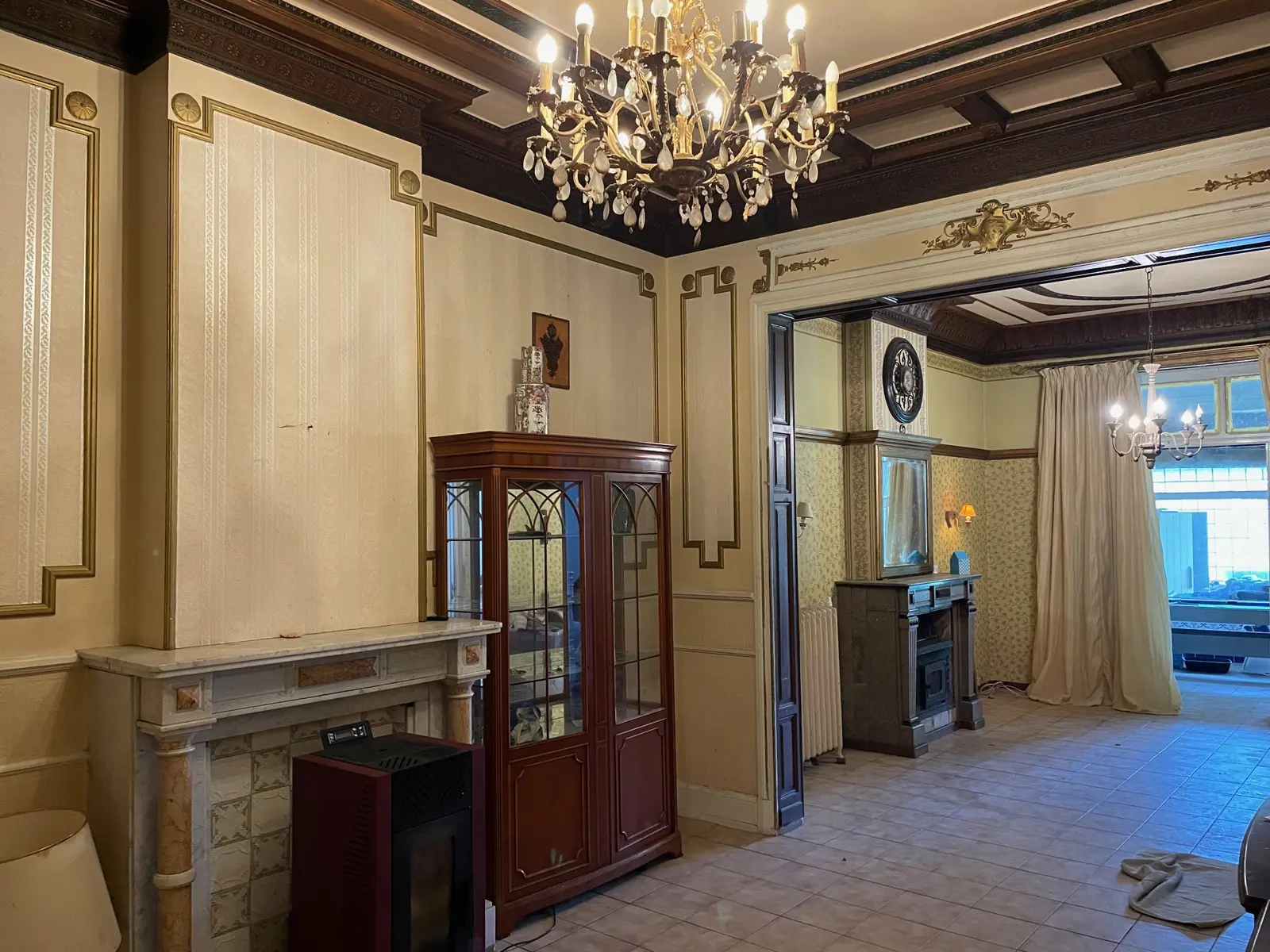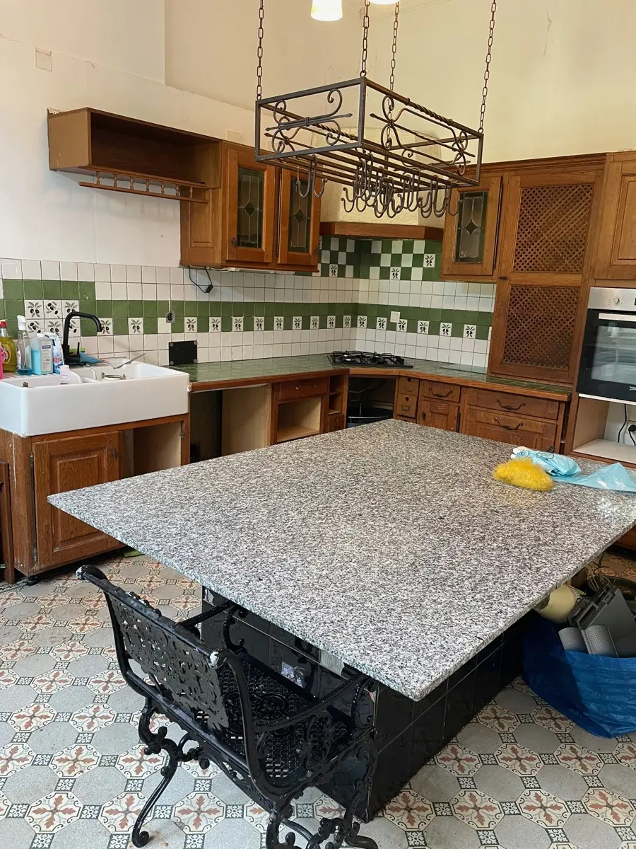 Rez-de-chaussée comprenant : vaste hall d'entrée, bureau, wc individuel, living 50 m², salle de billard avec bar, véranda avec barbecue, cuisine semi-équipée avec table à manger en marbre.