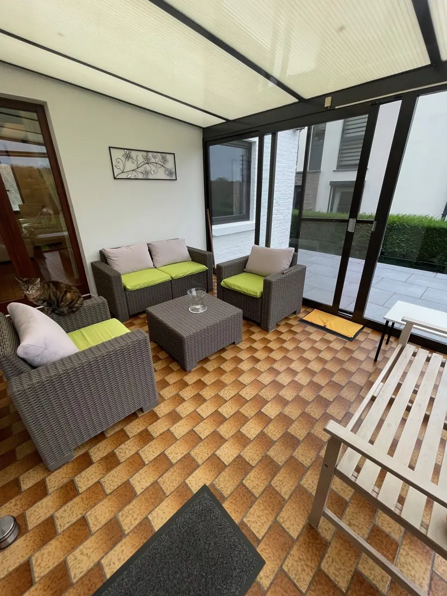 Rez-de-chaussée : living en L , cuisine-équipée avec coin à manger, salle de bain avec baignoire et wc, 2 chambres, véranda 10 m²
